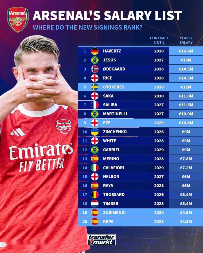 北京時(shí)間9月1日,德國轉(zhuǎn)會(huì)市場公布了阿森納球員的年薪排名,哈弗茨以1690萬歐元位居榜首,今夏新加盟的哲凱賴什和埃澤也進(jìn)入了前十名。